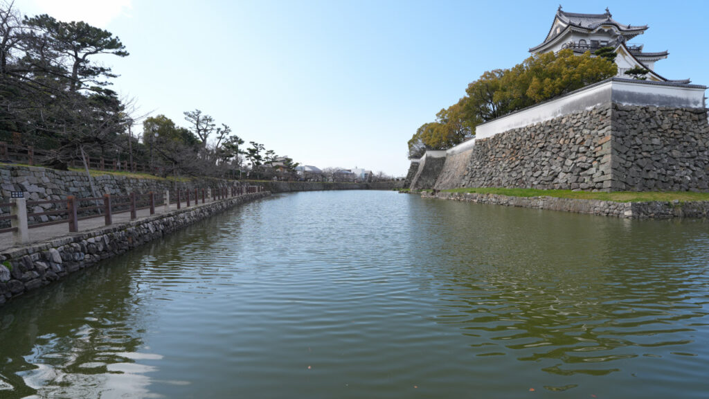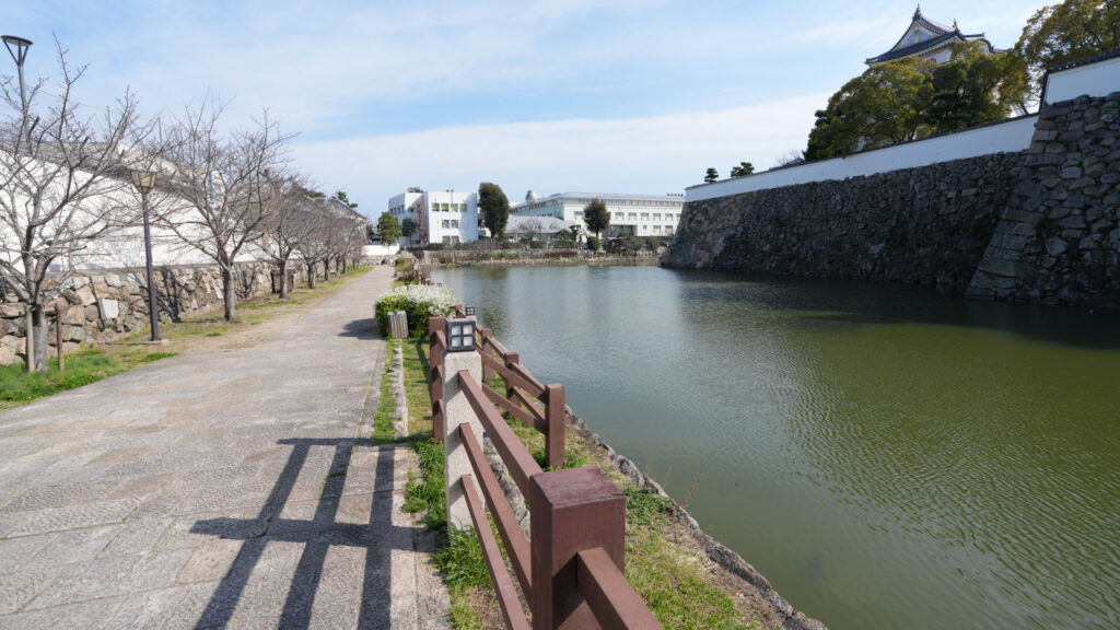 本丸北東側の水堀です。北から見ています。右側が本丸です。水堀の外側が遊歩道のようになっていて、堀に沿ってぐるりと回れるようになっています。