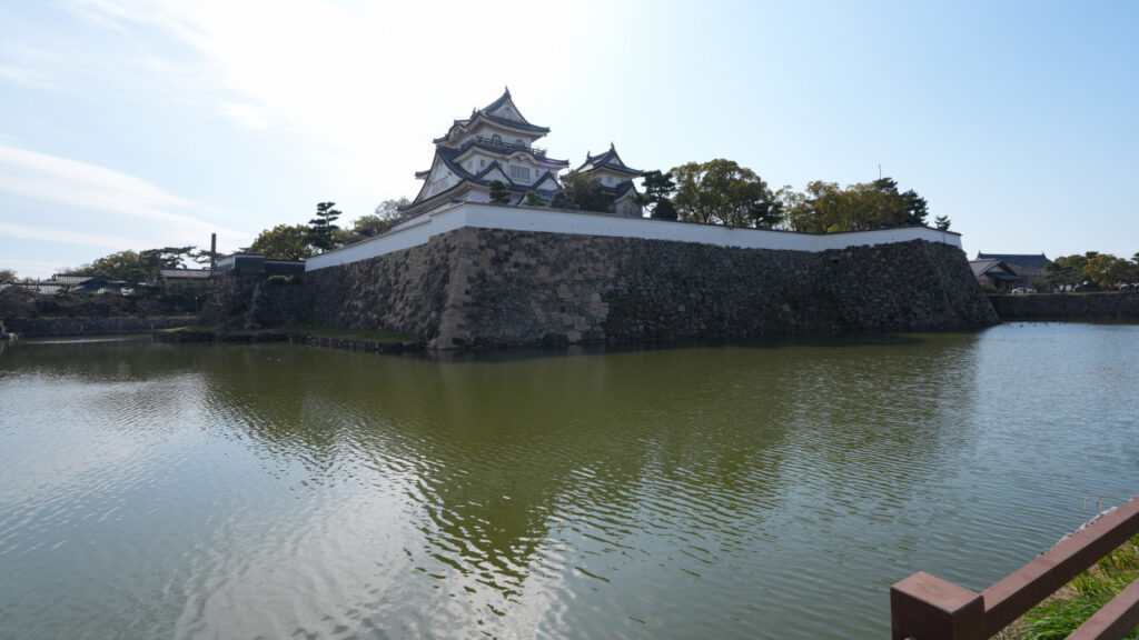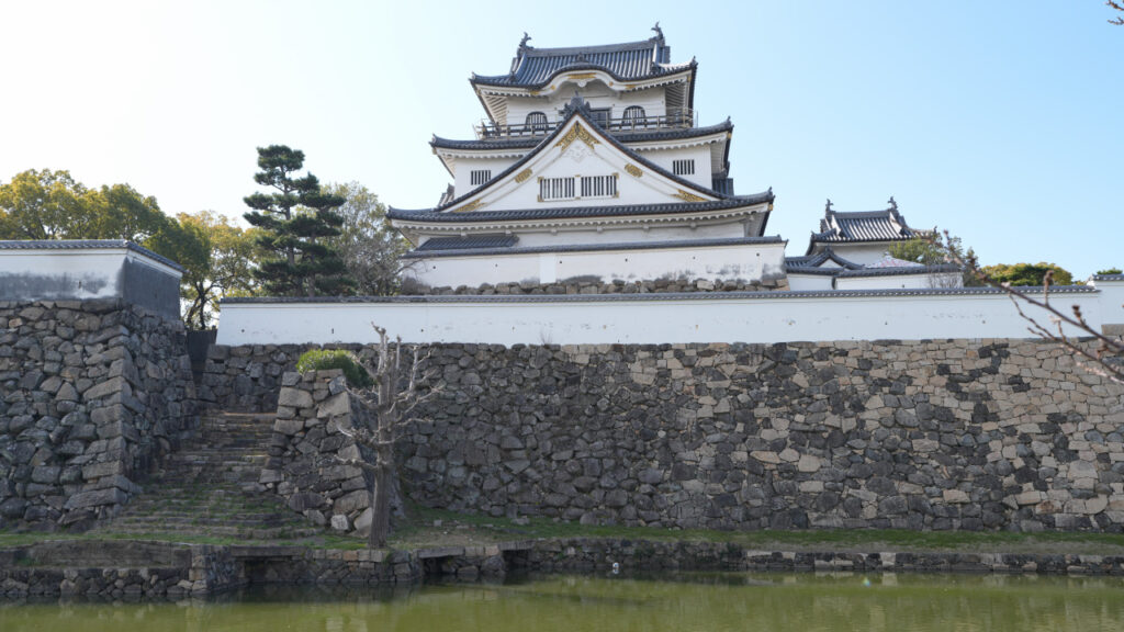 本丸水堀の外側から見た天守です。天守、塀、石垣、犬走り、水堀が同時に視界に入るこの角度から見る岸和田城が良いですね!建造物は全て復興されたものですが、やはり天守や塀もあると近世城郭らしさが感じられます。