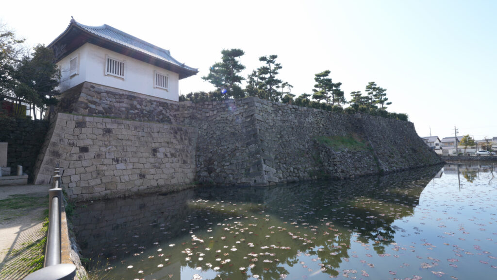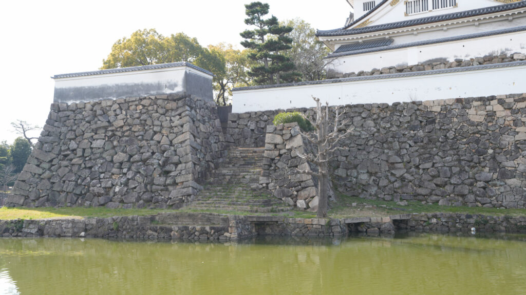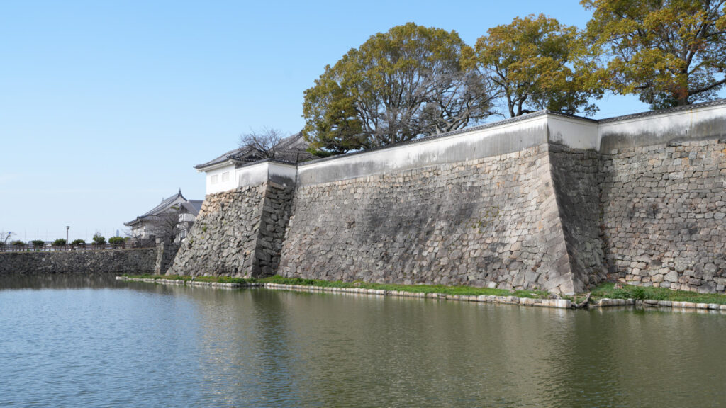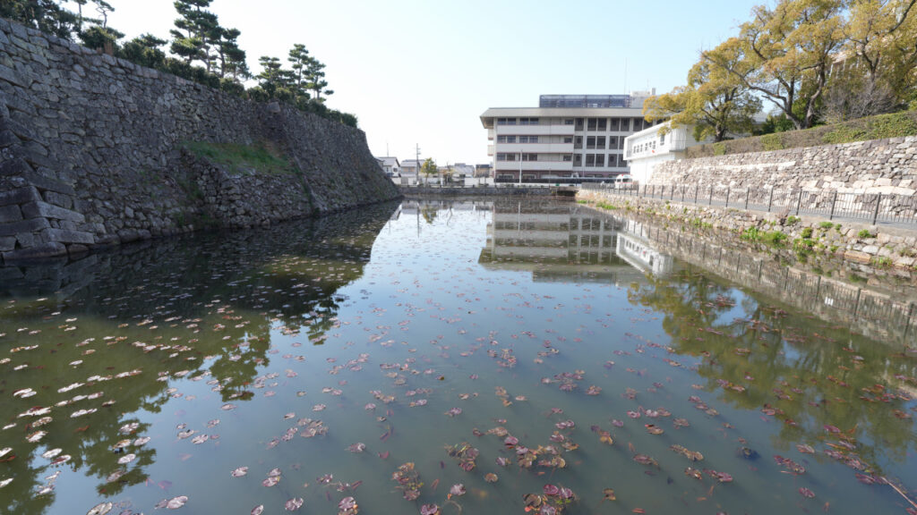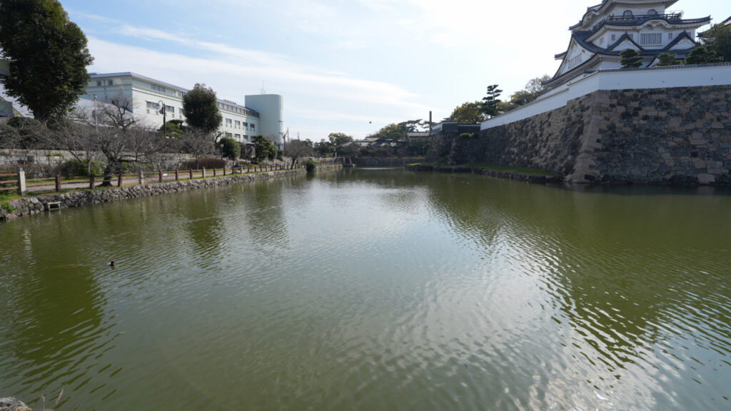 二の丸東側の石垣です。櫓っぽく見えているのは先ほどの二の丸多聞トイレです。東側の石垣と水堀を見ようと思ったら、トイレと岸和田市役所の間の小さな公園に行くと間近でよく見ることができます。近くの階段からその公園まで降りて行けます。