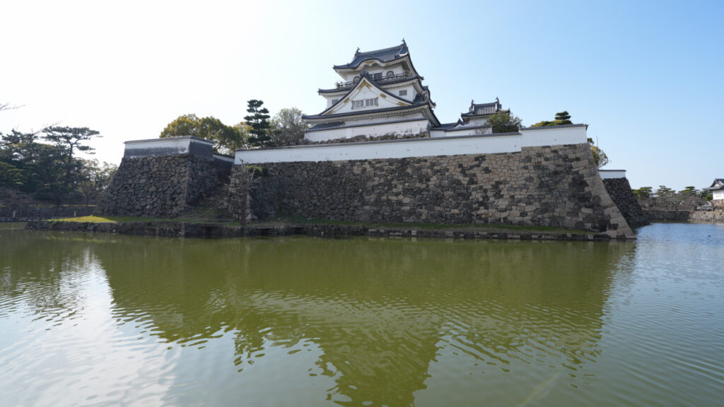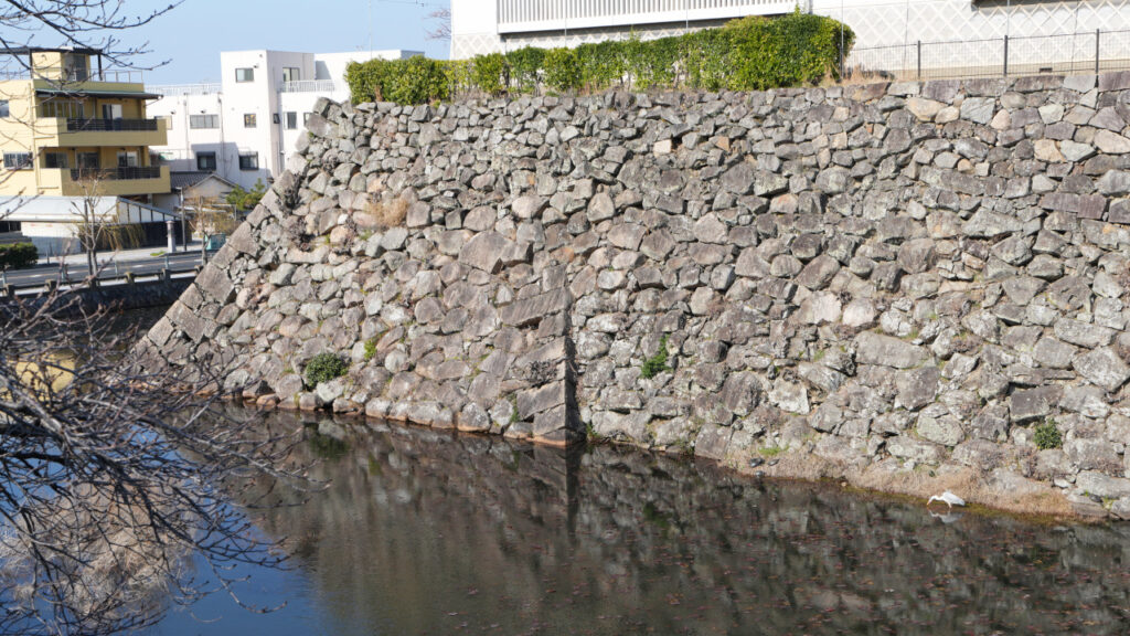 本丸、二の丸の石垣を外周をぐるりと回って見てみると、積み方の違いや巻き石垣、積み足された石垣など、多種多様な石垣を見ることができます。水堀に囲まれた天守のある本丸は近代城郭の雰囲気を感じることができます。