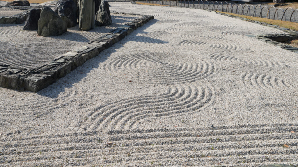枯山水なので、砂に水や波紋の模様があります。綺麗に手入れされていることが想像されます。維持していくのは大変だろうなと思いますので、感謝ですね。