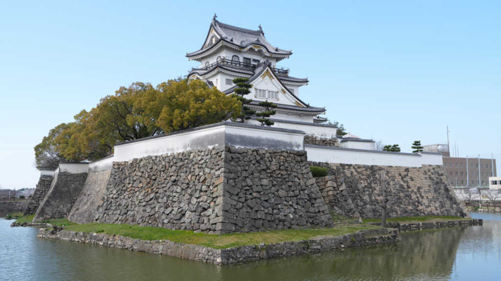 本丸は変則多角形で水堀に囲まれており、北西に二の丸が、北・東・南はコの字形に二の曲輪が取り囲み、その外周を水堀と三の曲輪が囲む輪郭式の縄張りとなっていました。本丸には5層の天守がそびえていたようですが、1827年に落雷によって焼失してしまったようです。