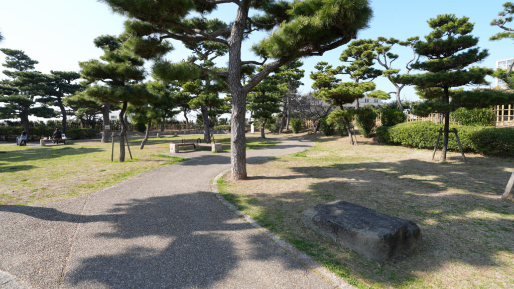 本丸の北西側に土橋で連結している曲輪が二の丸です。建物の遺構はなく、現在はこんな感じの広場になっています。広場の一画には観光交流センターがあり、岸和田城情報も得られますので、寄ってみるといいと思います。