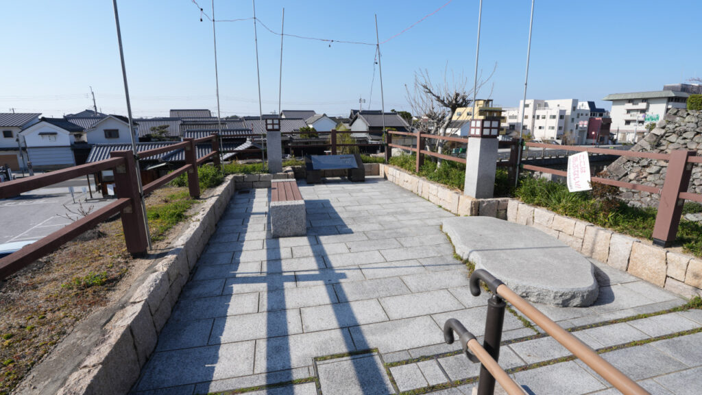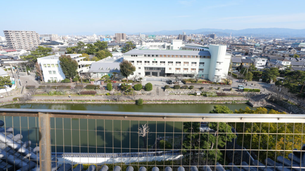 二の丸西側の水堀を挟んだ正面に展望スペースがあります。二の丸もよく見られますし、北側の紀州街道沿いにある城下町の街並みもよく見渡せます。
