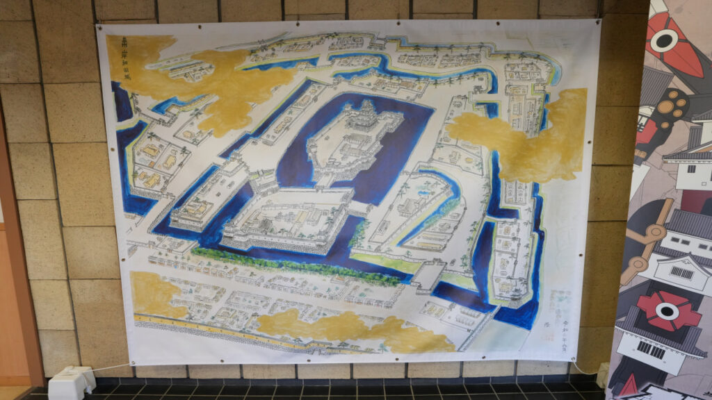 本丸隅櫓の中に展示してあった城の絵図です。いい絵ですね〜。往時の姿が描かれていると思います。水堀に何重にも囲まれた堅固な城ですね。現在は、真ん中に描かれている本丸とその下の二の丸、それらを取り巻く水堀が残っています。