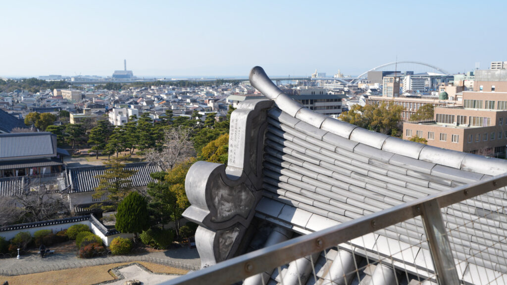 天守二重目の千鳥破風の先端部分の瓦もよく見えます。どうやら岸和田市長の署名が彫られているようです。