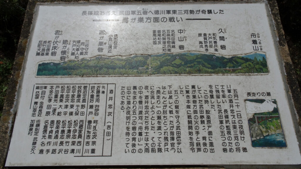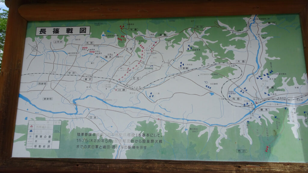 長篠城といえば、長篠の戦いですよね。城跡の所々にこんな風な案内板がありました。長篠の戦いの時の武田軍と織田・徳川軍の布陣図ですね。見ていて飽きないですね。
