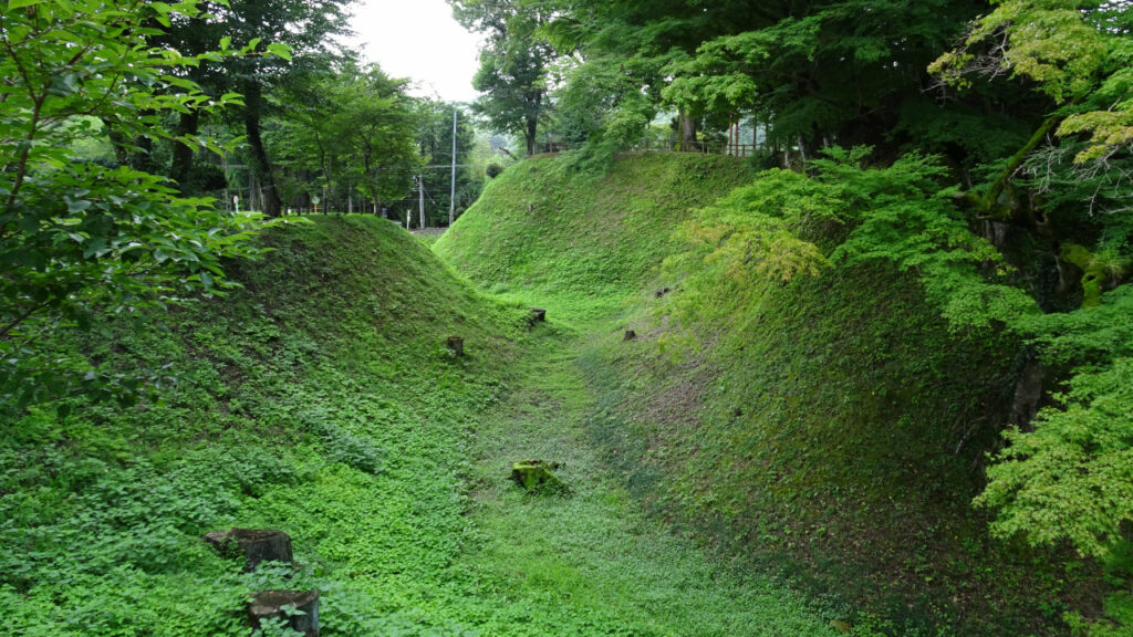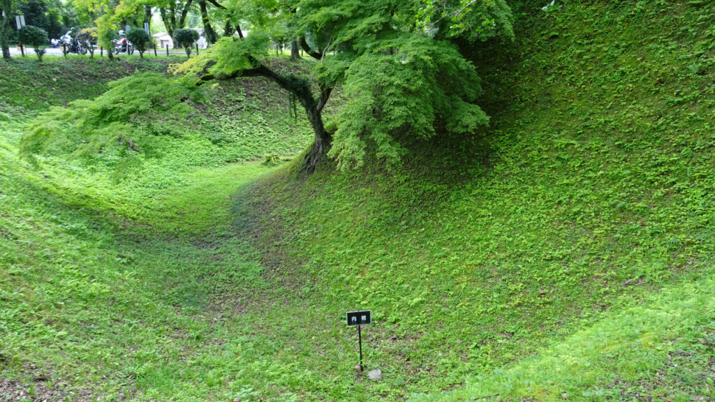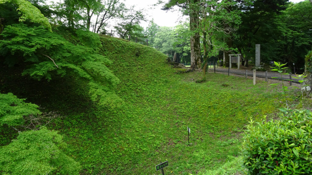 1枚目の写真を、逆方向から、土塁の上から見た感じです。右側が二の丸になります。壮観な景色です。