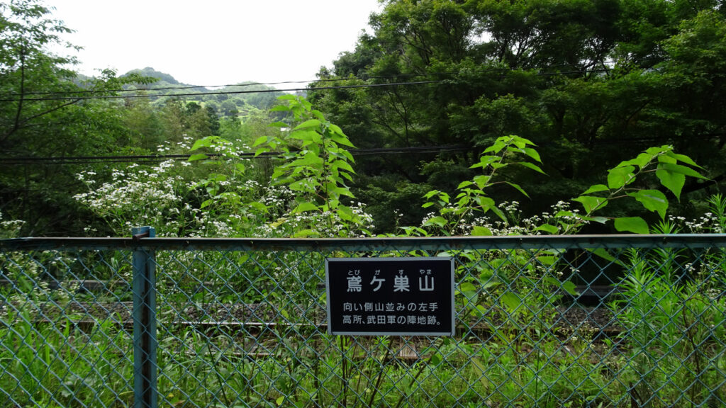 本丸の飯田線の線路際に鳶ケ巣山の案内がありました。武田軍の陣地跡ですが、このあたりから見えるようです。