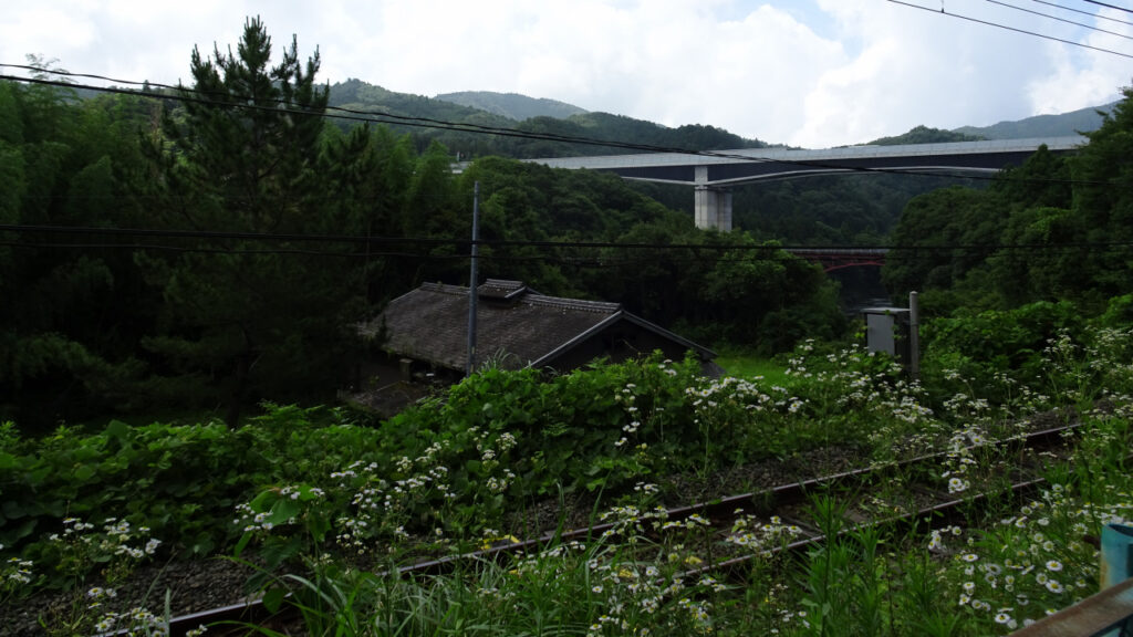本丸の東側は飯田線が走っているので、土塁の上からだと線路がよく見えます。手前の落ち込んでいる部分は内堀です。