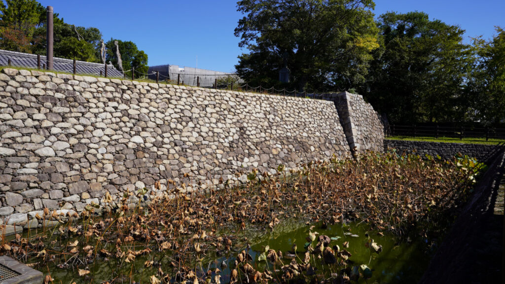 本丸下段南面の東側の石垣です。この石垣と水堀が復元されたようです。