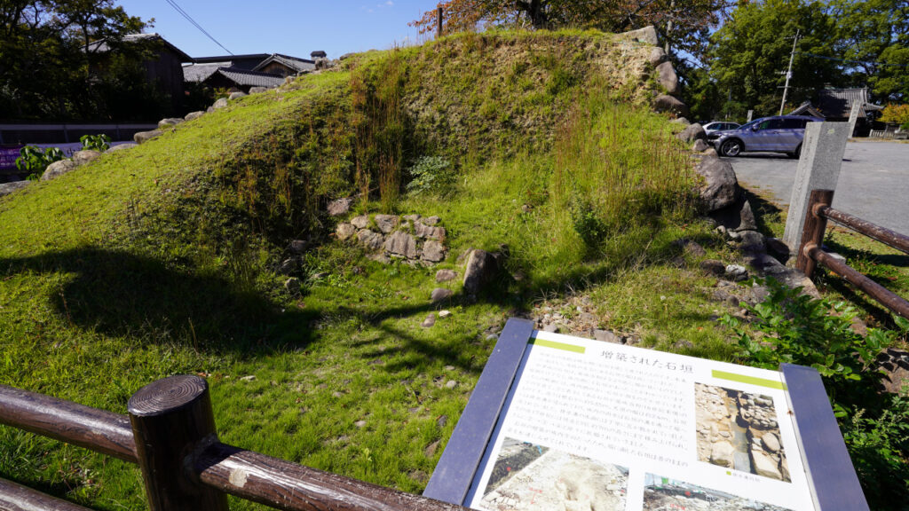 南面の石垣の真ん中あたりに古い石垣が見えています。何段階かにわたって石垣が増築されたようで、その様子がわかるようになっています。