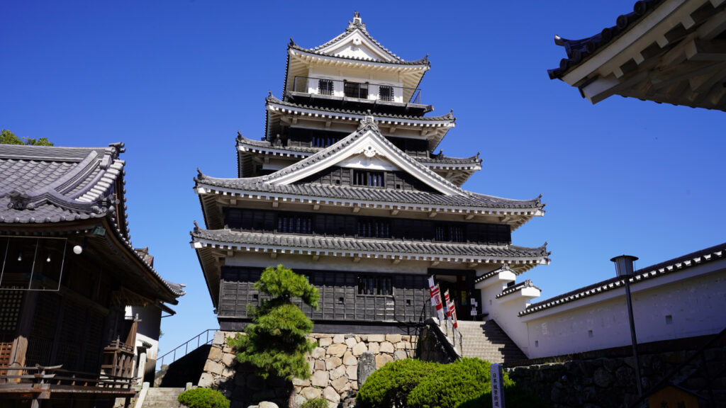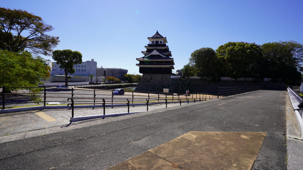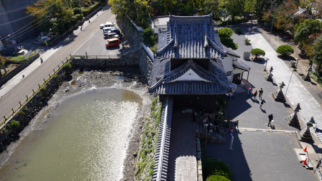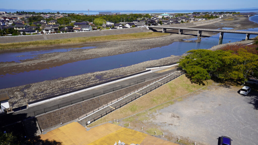 現存している城域は広くはありませんが、模擬天守に登って、最上階から見渡すと川を上手く活用した海城だということがよくわかります。