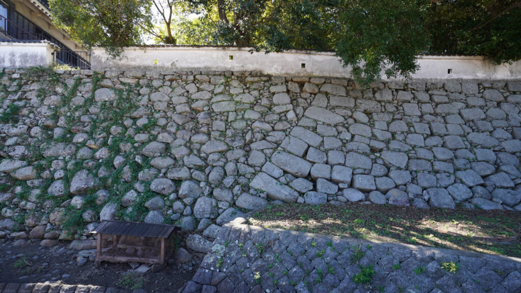 ここに、積まれた時代の違いがはっきりわかる石垣があります。Y字になって目地が通っている(斜め左の線のように見える)場所が境目で、右側が黒田時代の石垣で、左側が細川時代の石垣です。細川時代は自然石のようで、黒田時代の石は四角く加工されているため、黒田時代の方が一見新しいように見えますが、実はその逆で、先に積まれていた方が黒田時代です。黒田氏はどうやら近くの7世紀の遺跡である唐原山城(とうばるやまじろ)の神籠石と呼ばれる直方体に整形された石を持ってきて使ったようです。