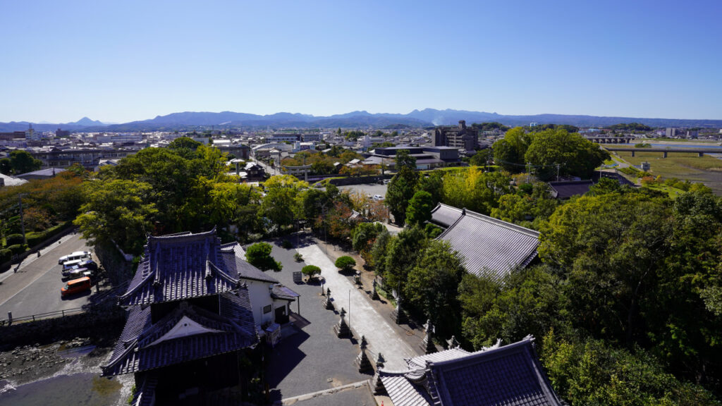 最上階は展望室になっており、周りが見渡せて眺望は素晴らしいです。南側は眼下に本丸跡が、遠くには大分県に横たわる山々が望めます。