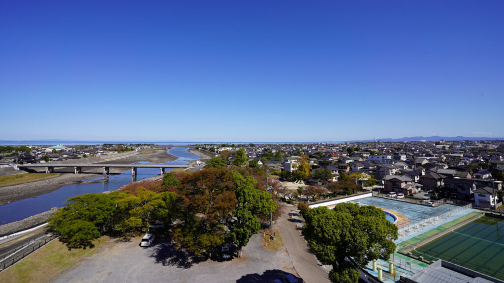 中津川のすぐ先は海に繋がっていて、その繋がった先の海までよく見えます。