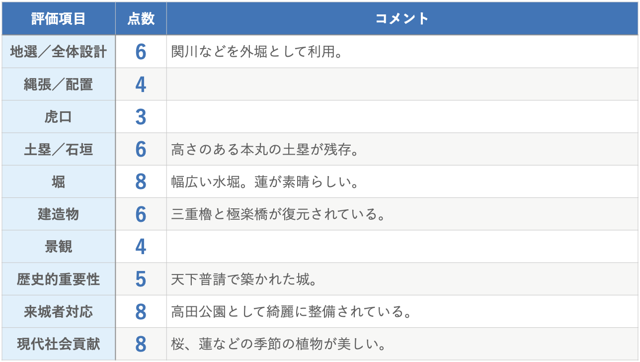 高田公園としてよく整備されており、見学しやすい城です。広大な水堀と雰囲気ある三重櫓をぜひ楽しんでください。