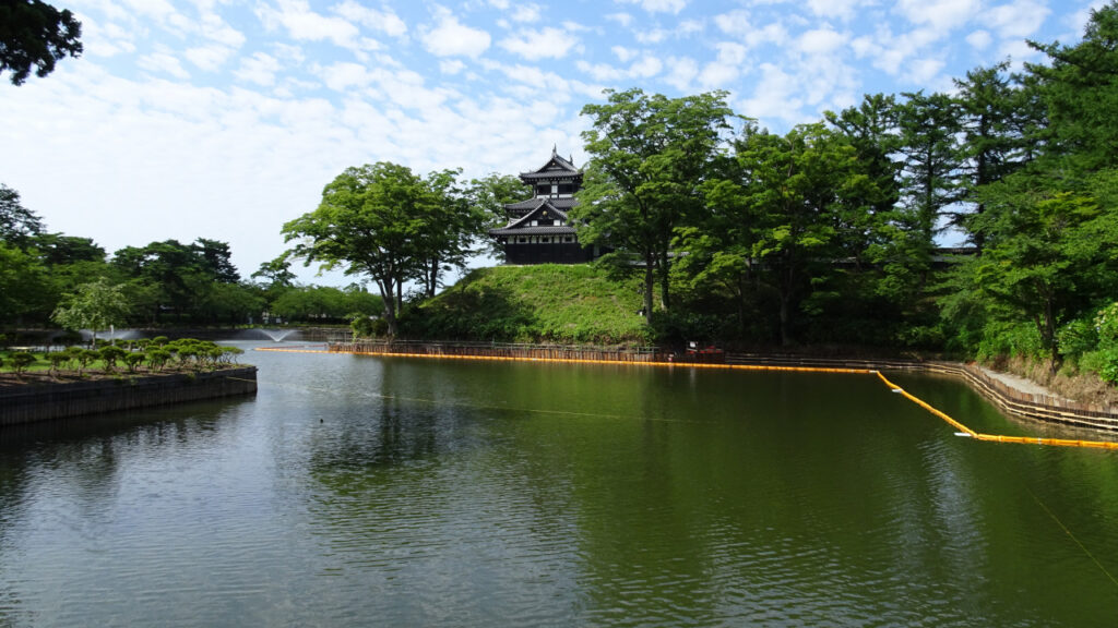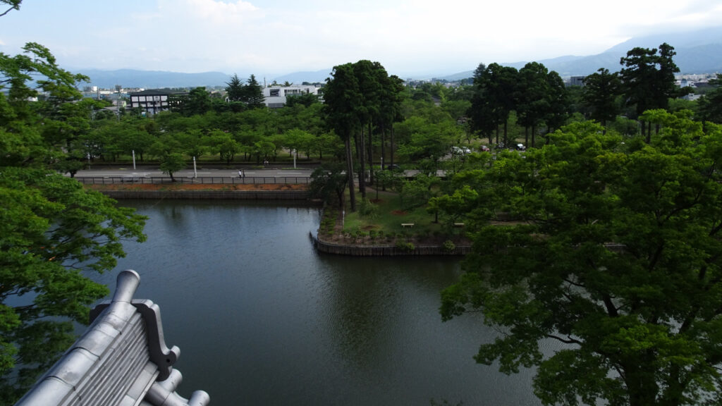 高田城は高田平野の西部を流れる関川沿いの丘陵地に築かれた平城です。約230m四方の本丸を中心に、二の丸、三の丸が輪郭式に配置されています。水堀は広大で、石垣は築かれず全て土塁で構築されています。高田城唯一の櫓である天守代用の櫓は、1624年に松平光長によって建てられましたが、二重櫓だったようです。1666年の高田地震後の復旧で三重三階の三重櫓になったと考えられています。
