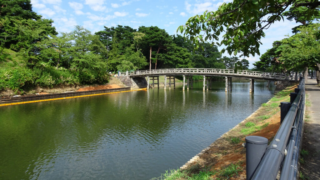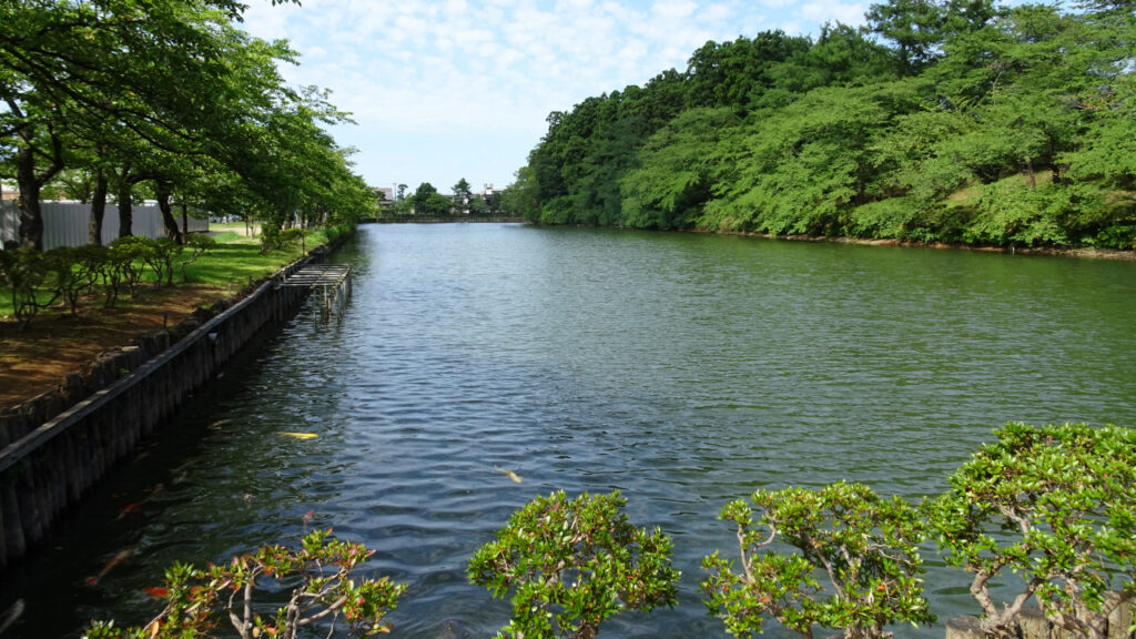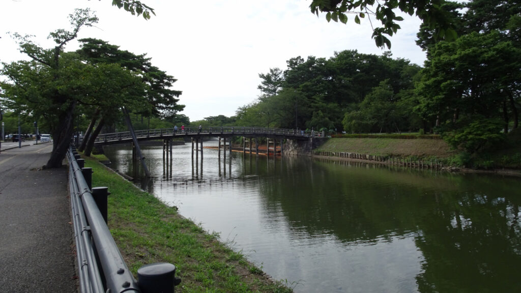 北堀は本城堀よりもさらに堀幅が広いです。学校の校舎が見えてますが、あそこまで堀です。