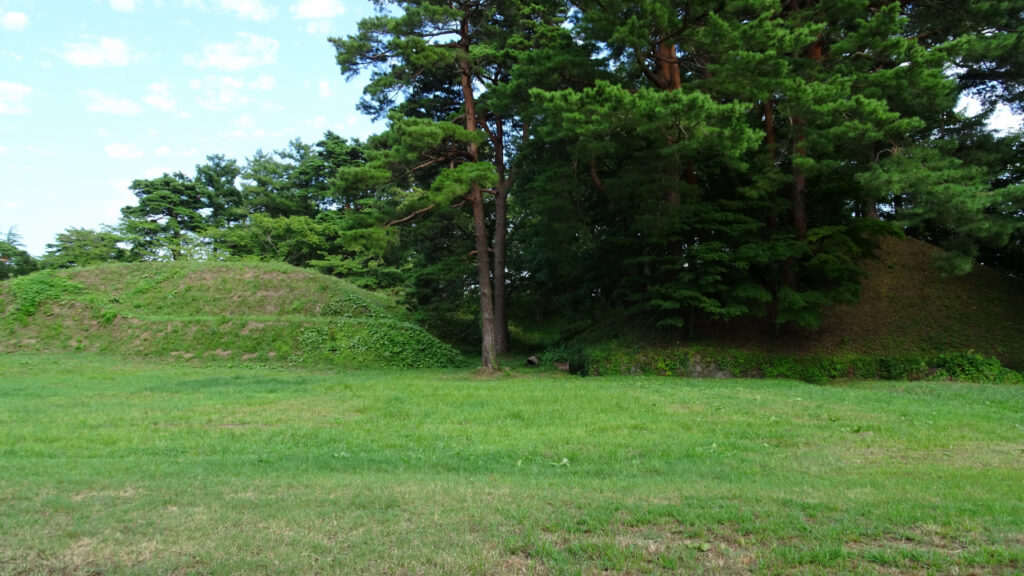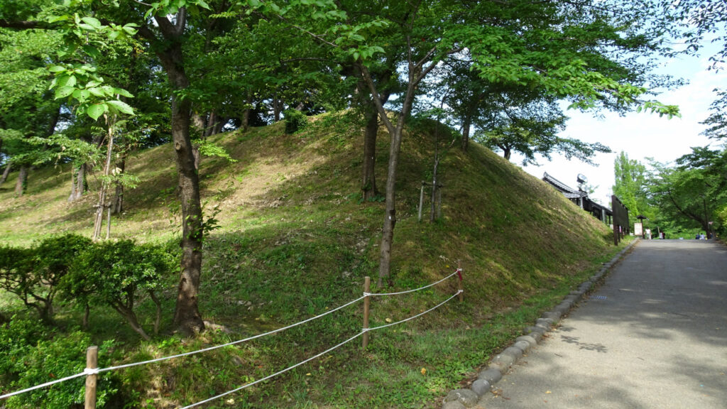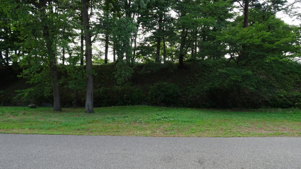 こちらは三重櫓付近の土塁で、本丸西側の水堀に沿って構築されていたものと思われます。本丸の土塁はどれも高さがあります。