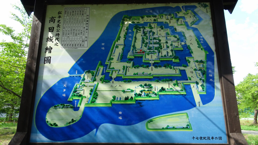 江戸時代の高田城の絵図です。本丸、二の丸、三の丸が幅広い水堀に囲まれています。石垣はなかったようですが、土塁と堀で防御力は高く造られていそうです。さすがに天下普請だけあって広大な城域です。