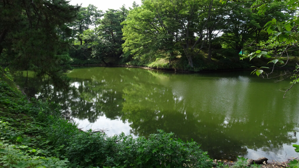 絵地図に本城堀と記載されてましたのでそう書いていますが、本丸を囲んでいる水堀のことです。こちらは西側の堀です。右側が本丸です。