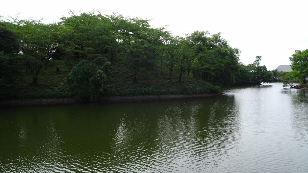 東側から見た北東隅あたりの水堀です。本丸土塁も見えます。北東なので、鬼門除けとして角が潰されていますね。それにしても広大な水堀ですね。石垣はありませんが、この幅の広い水堀であればかなり堅固な守りになりますね。
