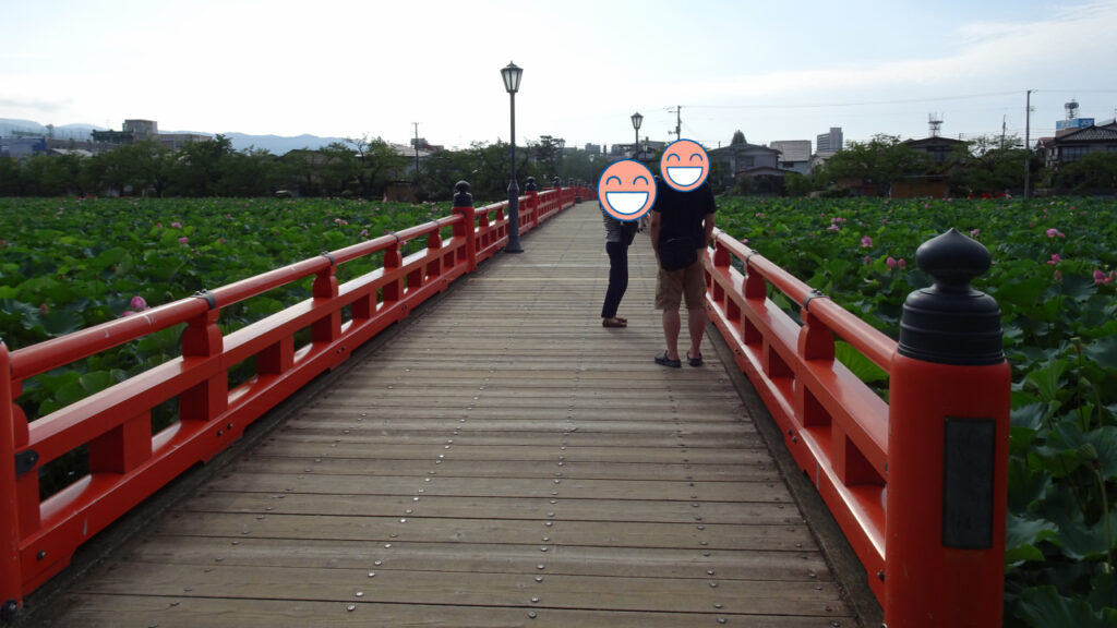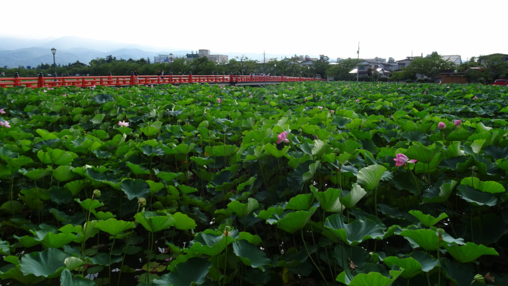 西堀橋の朱色が蓮の緑に映えてます。