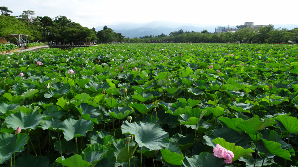 西堀は長さも幅も長大です。また、一面の蓮の規模は素晴らしく、「東洋一」だと言われているみたいですね。是非、夏の蓮まつりの時期に訪れてみてください!