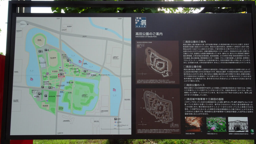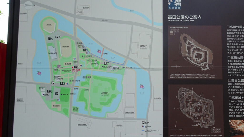 こちらは現在の高田公園の案内図です。右方向が北になっています。現在、本丸には学校があり、三の丸には陸上競技場や野球場まであります。広い!