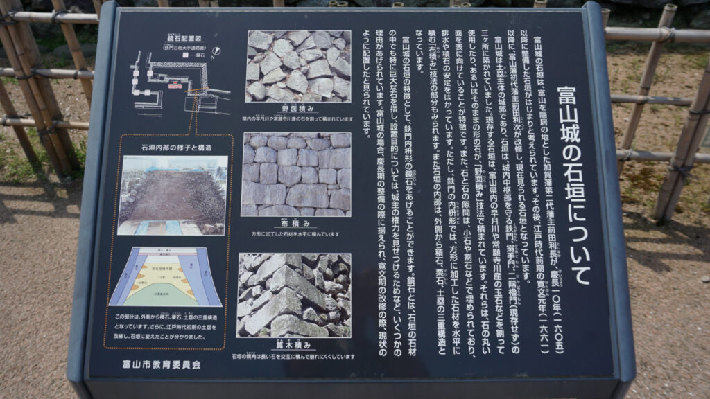石垣に関する説明板がありました。これによると、富山城の石垣は野面積み布積みなど、様々な技法で積まれた石垣が混在しているようです。