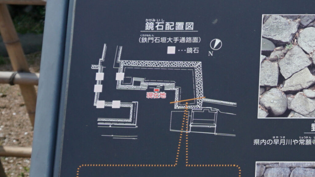 特筆すべきは鏡石で、先ほどの説明板の左上に配置図が載っています。なんと、鉄門枡形には5つも鏡石があります!同じ場所にこれだけ鏡石がある城は他にないかもしれません。