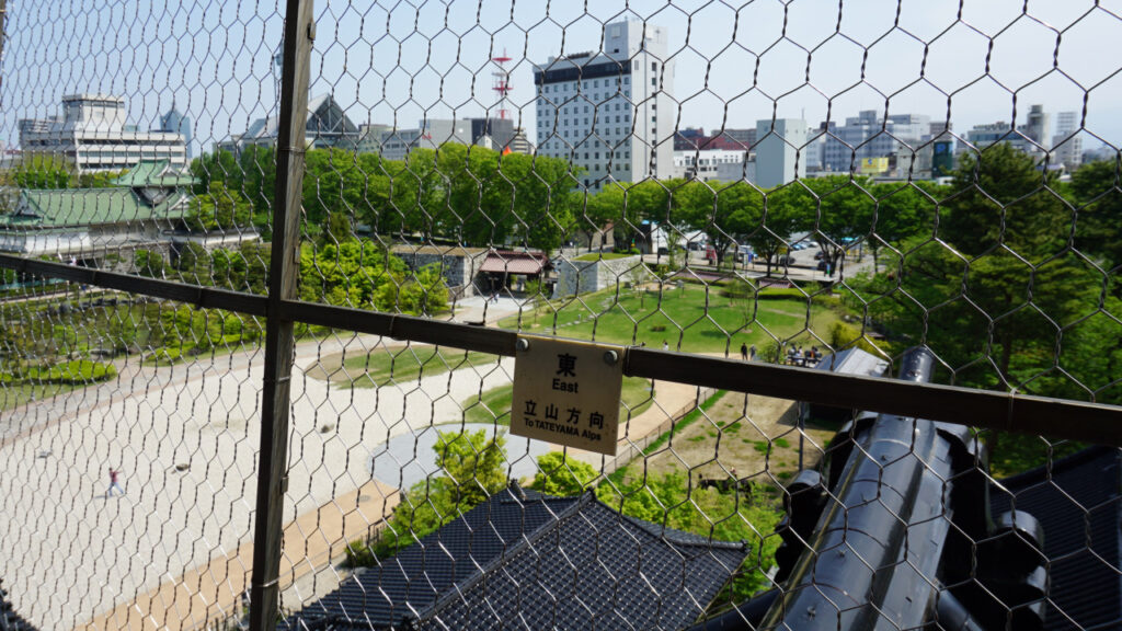 最上階の展望台は回廊になっていて、周辺が一望できます。金網があり写真的には難しいですが、こちらは東側の城内です。千歳御門も見えます。