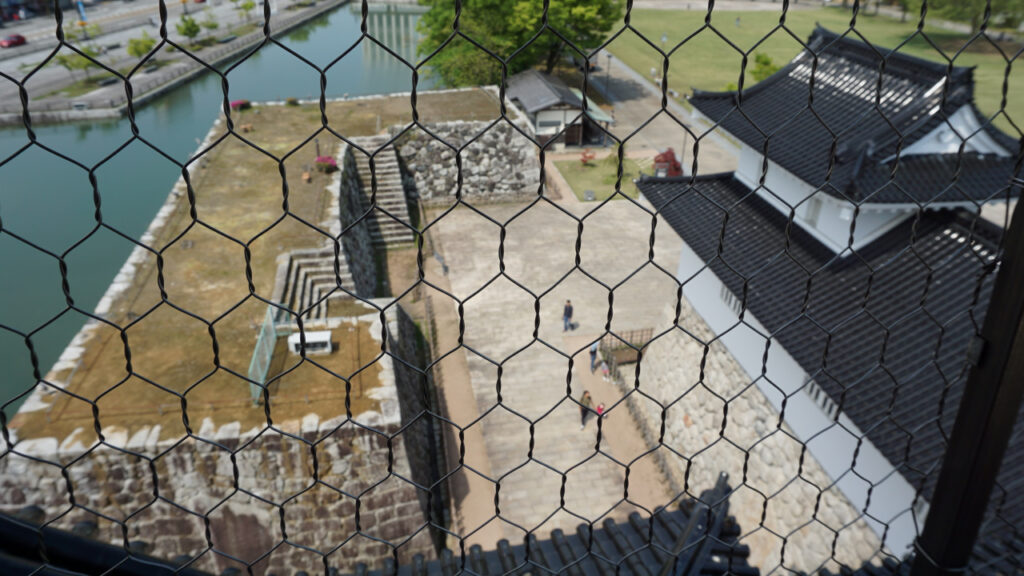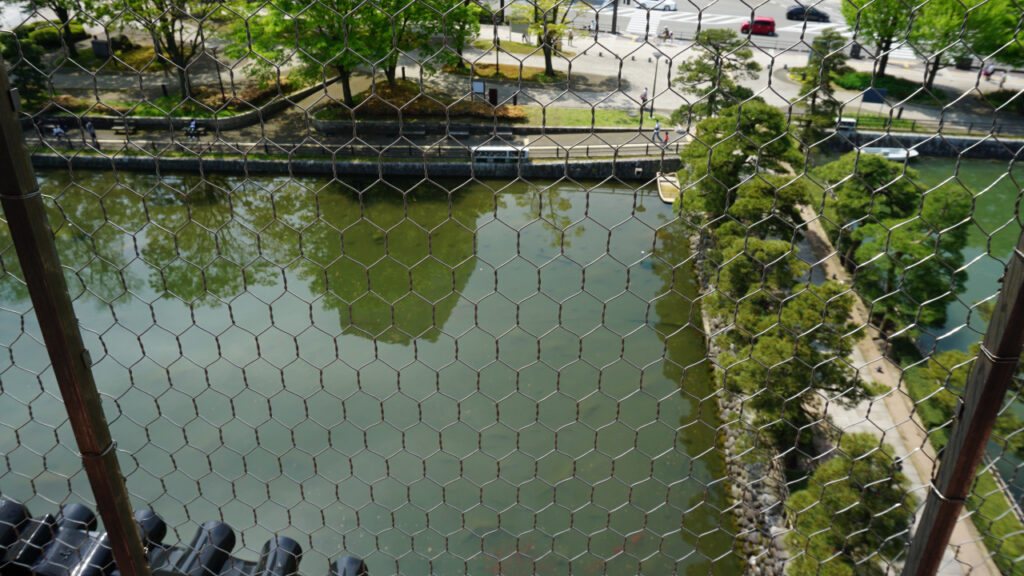 こちらは西側で、多聞櫓の石垣鉄門枡形が見下ろせます。金網にピントが合ってしまい、写真的には失敗してます…。