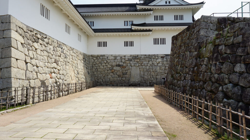 鉄門枡形の石垣は5つも鏡石があり、必見です。堀と石垣、天守の雰囲気を味わってください。