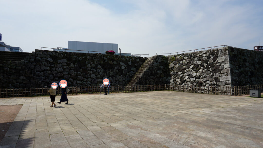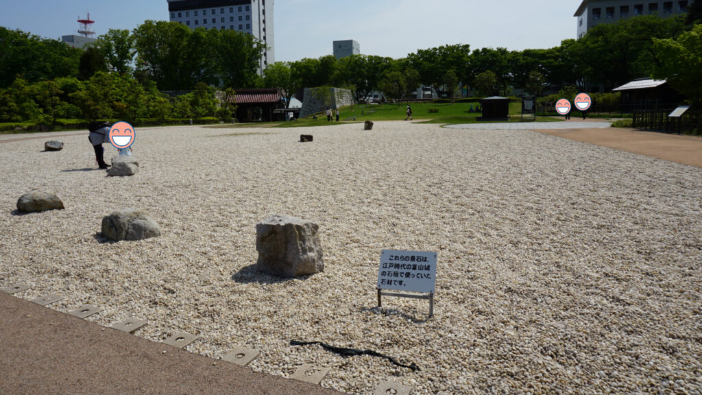 模擬天守、石垣、千歳御門の一帯は、富山城址公園として整備されています。こちらは模擬天守前の広場で富山城の石垣に使われていた石材の展示です。