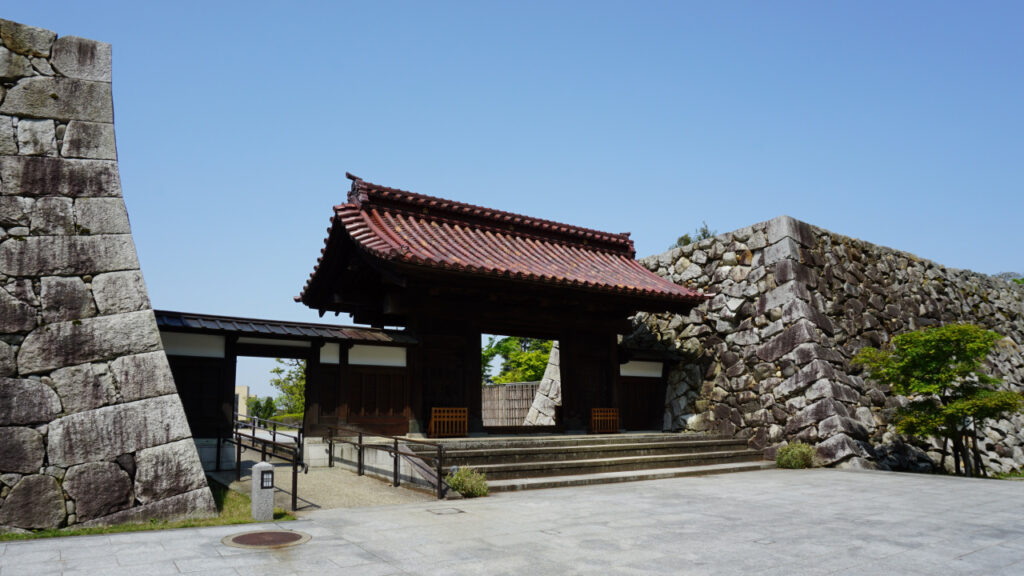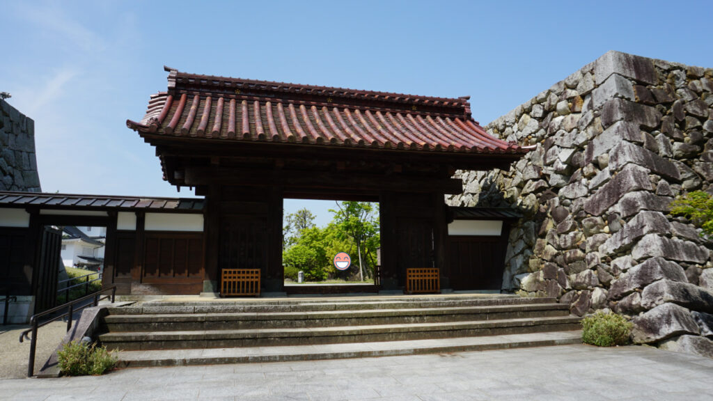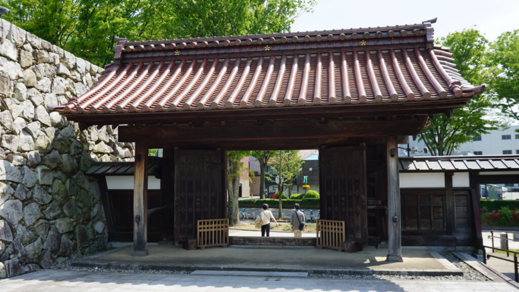 三間薬医門(さんげんやくいもん)と呼ばれる格式高い城門建築のようです。総檜造りで、屋根には赤れんがが使用されています。現存する同形式の門は東大の赤門だけだとされており、貴重な建築物であることから2008年に市指定文化財に指定されています。風格ある立派な門ですね。
