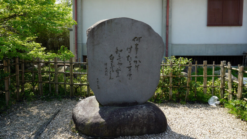 世の中は変わっていく、つまり、自分は激動の中で変わり果てていくけど、雪は何も変わらずに降っている、という意味だと思われます。佐々成政が秀吉に降伏した時に詠んだ歌だと言われています。まさにこの場所で詠んだのかもしれませんね。個人的には好きな武将の一人なので感慨深いです。これを作ろうと思った人は渋カッコいいですね、、よくぞ作った!という感じです。